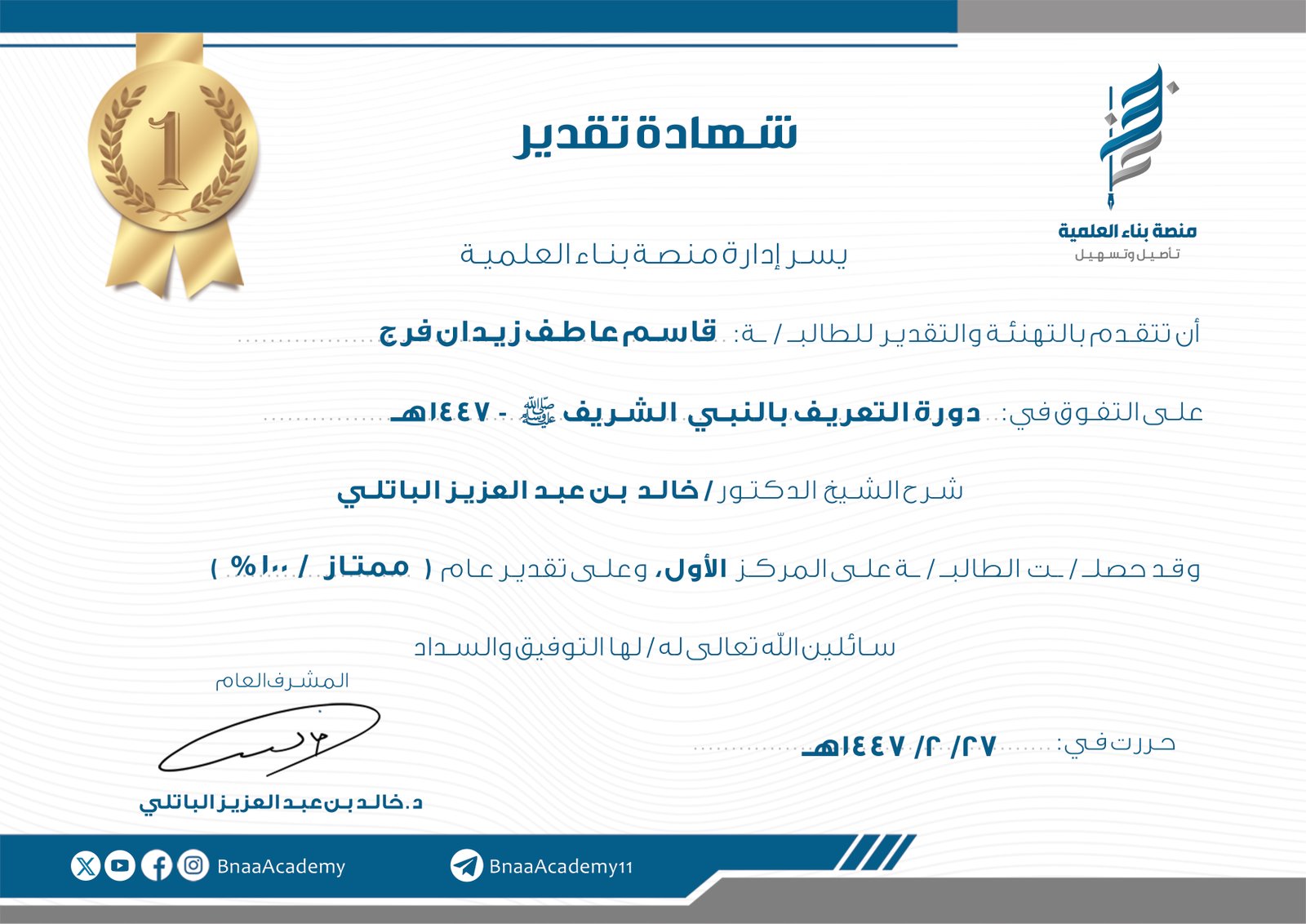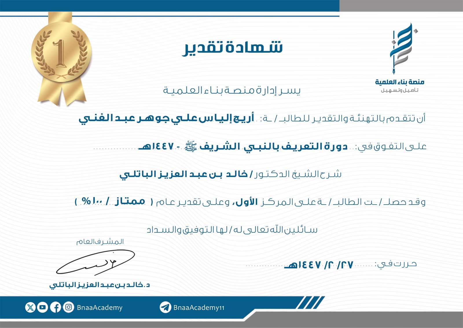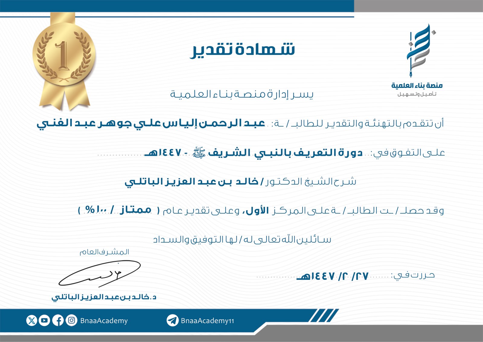 أسماء الأوائل في دورة التعريف بالنبي الشريف ﷺ – 1447هـ يسر إدارة منصة بناء العلمية أن تتقدم لكم بخالص الشكر والتقدير على تفوقكم في دورة التعريف بالنبي الشريف ﷺ – 1447هـ، ونقدم لكم هذه الشهادة تقديرًا لجهودكم. لمعاينة الشهادة وتنزيلها فضلًا الضغط على زر معاينة الشهادة المركزالاسمالشهادة المركز الأول [ %100 ]إلياس مولانا علي جوهر عبد الغنيمعاينة الشهادة إيناس إلياس علي جوهر عبد الغنيمعاينة الشهادة أريج إلياس علي جوهر عبد الغنيمعاينة الشهادة أنس إلياس علي جوهر عبد الغنيمعاينة الشهادة عبد الرحمن إلياس علي جوهر عبد الغنيمعاينة الشهادة عبير احمد جفالةمعاينة الشهادة قاسم عاطف زيدان فرجمعاينة الشهادة مروه عادل محمد عبد الغفارمعاينة الشهادة هزار محمد نوري الخانيمعاينة الشهادة المركز الثاني [ %99.27 ]رشا محمد فتوحمعاينة الشهادة ضياء الدين كمال محمود عبدالرحيممعاينة الشهادة مصلح بن عبد الله خراص السواطمعاينة الشهادة Om belal khaledمعاينة الشهادة