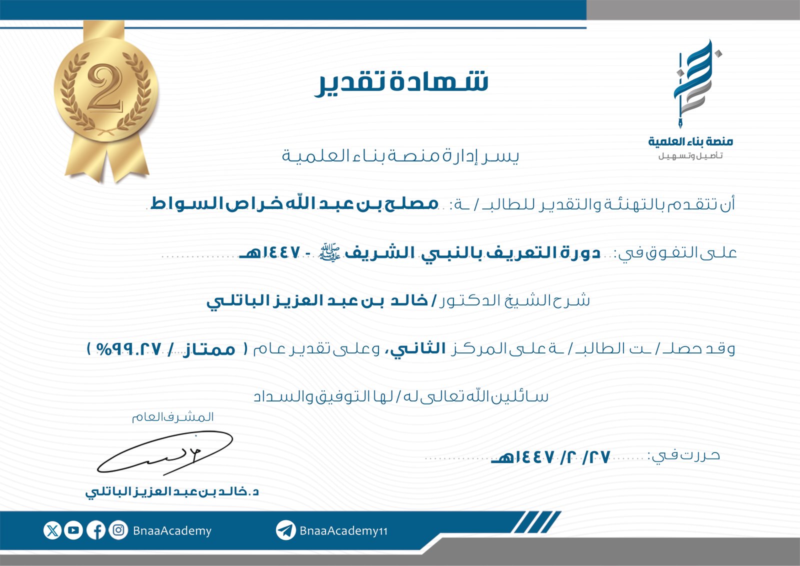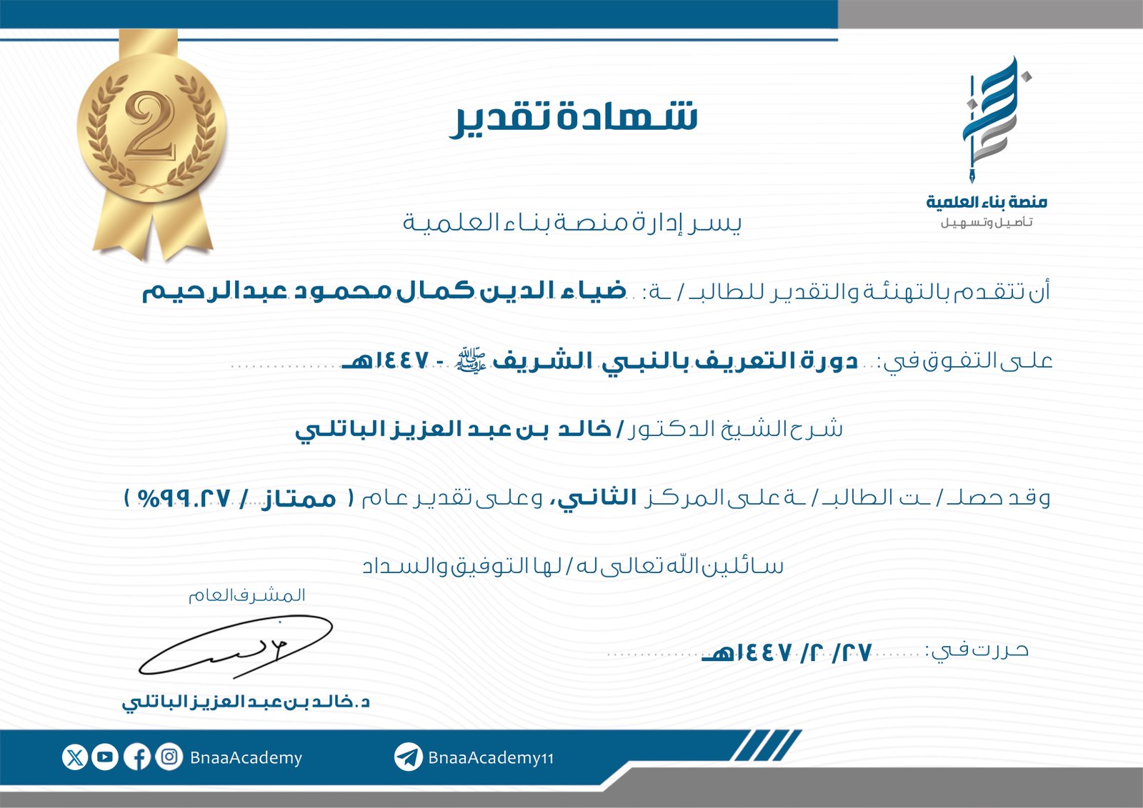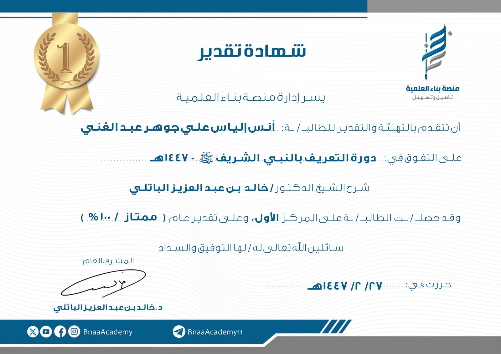 أسماء الأوائل في دورة التعريف بالنبي الشريف ﷺ – 1447هـ يسر إدارة منصة بناء العلمية أن تتقدم لكم بخالص الشكر والتقدير على تفوقكم في دورة التعريف بالنبي الشريف ﷺ – 1447هـ، ونقدم لكم هذه الشهادة تقديرًا لجهودكم. لمعاينة الشهادة وتنزيلها فضلًا الضغط على زر معاينة الشهادة المركزالاسمالشهادة المركز الأول [ %100 ]إلياس مولانا علي جوهر عبد الغنيمعاينة الشهادة إيناس إلياس علي جوهر عبد الغنيمعاينة الشهادة أريج إلياس علي جوهر عبد الغنيمعاينة الشهادة أنس إلياس علي جوهر عبد الغنيمعاينة الشهادة عبد الرحمن إلياس علي جوهر عبد الغنيمعاينة الشهادة عبير احمد جفالةمعاينة الشهادة قاسم عاطف زيدان فرجمعاينة الشهادة مروه عادل محمد عبد الغفارمعاينة الشهادة هزار محمد نوري الخانيمعاينة الشهادة المركز الثاني [ %99.27 ]رشا محمد فتوحمعاينة الشهادة ضياء الدين كمال محمود عبدالرحيممعاينة الشهادة مصلح بن عبد الله خراص السواطمعاينة الشهادة Om belal khaledمعاينة الشهادة